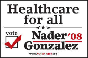 Millions of Americans still do not know that Ralph Nader is running for President. Here's one way to solve that problem. Buy a four pack of Nader/Gonzalez car magnets. And turn your vehicle into a Nader/Gonzalezmobile. (We're selling them at cost -- $60 for the four-pack -- and that includes shipping.) Because of time constraints, you need to buy them today. We have only a limited number of four-packs -- so act now. Once you hit that button, we'll ship them pronto. You should get them in three days. When you get them, put them on your car. And dedicate one full day to driving your Nader/Gonzalezmobile through high visibility spots in your neighborhood -- preferably during morning or evening rush hour. Then repeat on another day. Or loan your car magnets to another Nader supporter to do the same thing. The idea is to get 1,000 of you -- our loyal supporters -- to turn your vehicles into a campaign billboard for a day. And don't forget to keep your magnets on full display on election day. Visibility on November 4 is key. We estimate that 1,000 Nader/Gonzalezmobiles will reach 10 million voters in the last week of the campaign. So, buy your Nader/Gonzalez car magnets now. Your purchase will also help us drive our fundraising widget to our goal of $200,000 by Friday night. (As of this writing, we're closing in on $110,000) Let's increase our visibility. As we drive toward $200,000 by Friday. And a big Nader/Gonzalez turnout on election day. Let's get it done. Onward to November. The Nader Team